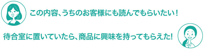 ぜひ今後は、施術ルームの待合室やパウダールームなど、お客様の目につく場所に置いて頂き、お手に取って頂けるようご協力をお願い申し上げます。